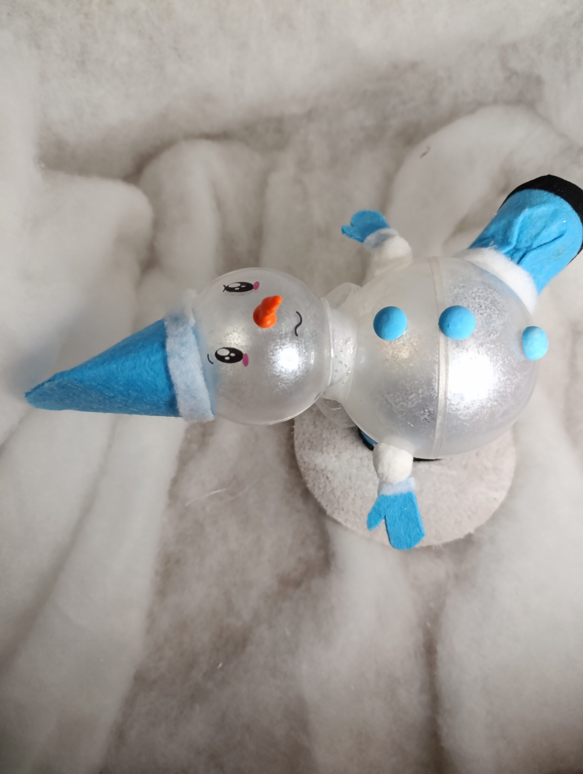 Son petit bonnet bleu ciel, ses moufles assorties et ses joues délicatement rosées lui donnent une allure tendre et fragile, celle qui donne immédiatement envie de le protéger. Son expression, réalisée à l’aide d’autocollants décoratifs premium, capture à merveille ce petit air inquiet, maladroit… et beaucoup trop mignon.