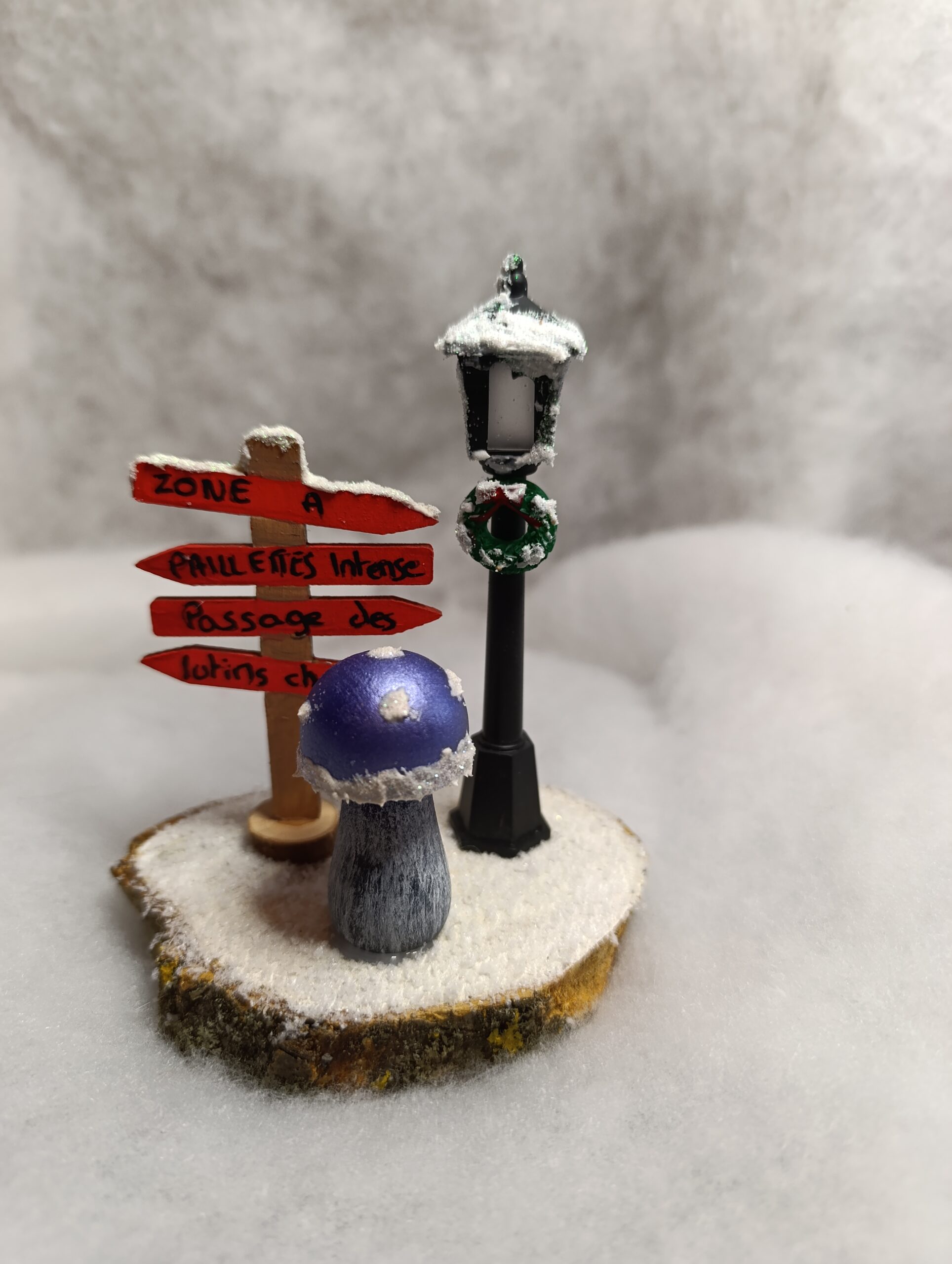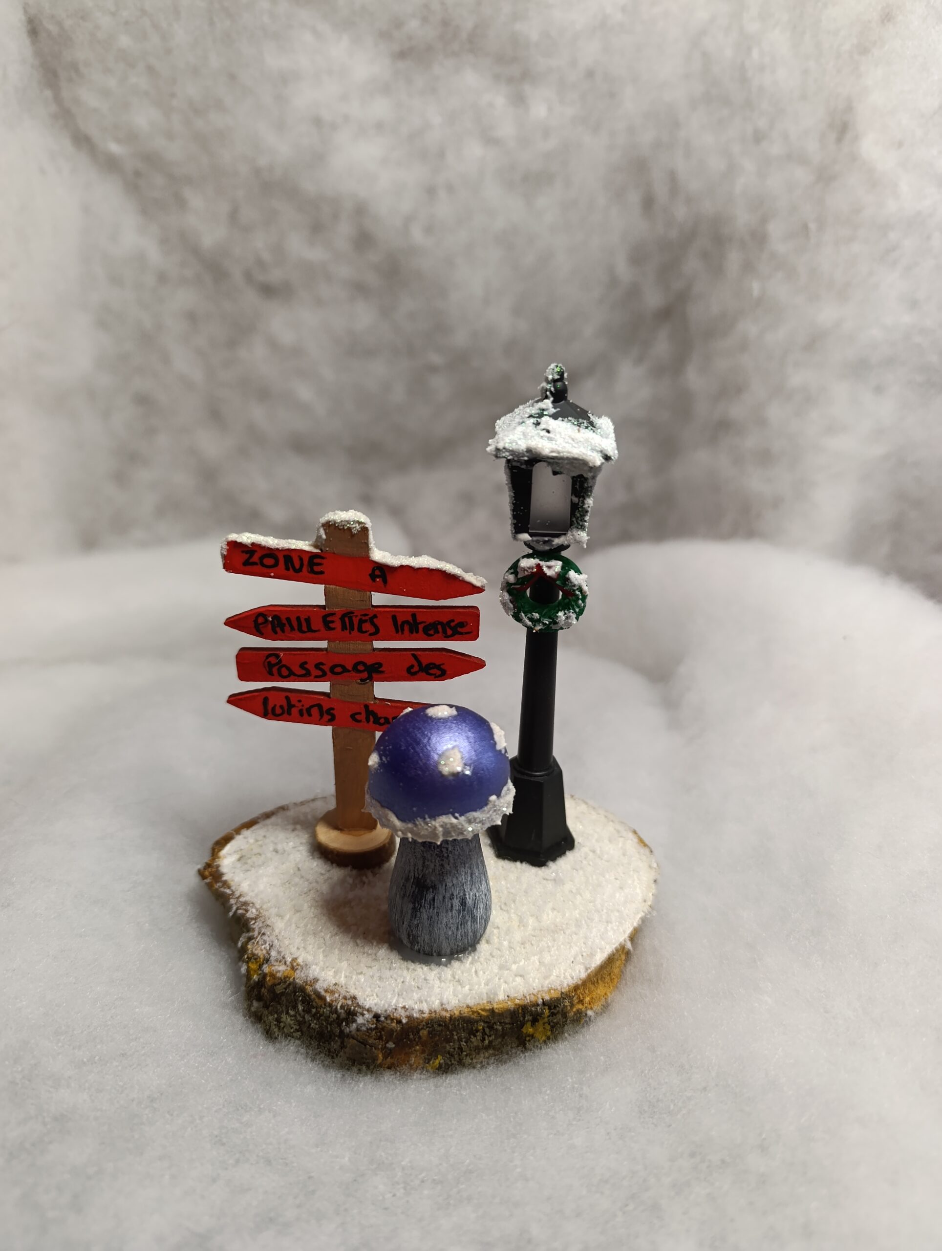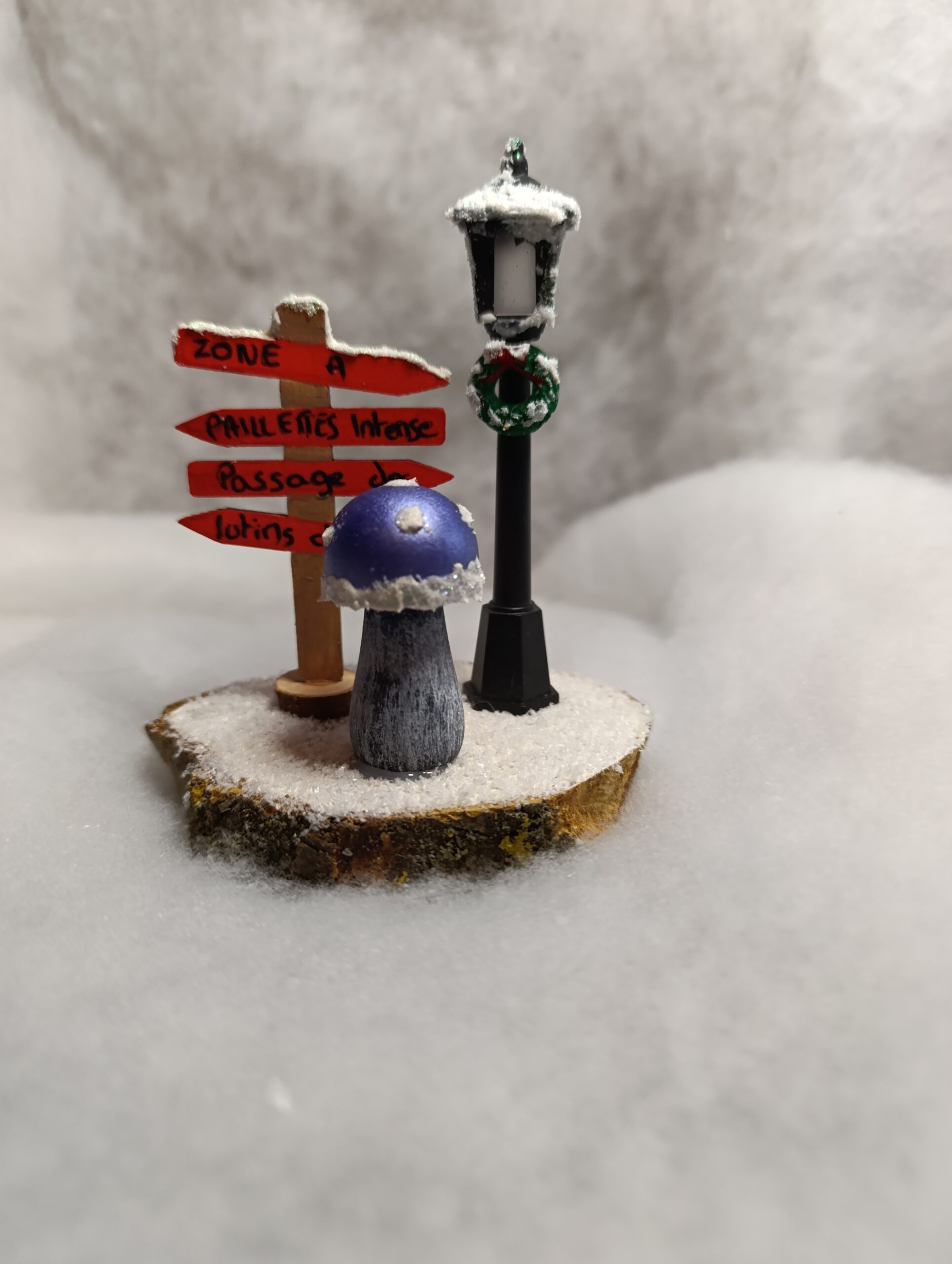 Un champignon bleu, doucement poudré de blanc, se dresse comme un repère secret. À ses côtés, un panneau directionnel un peu malicieux indique des destinations que l’on ne trouve sur aucune carte ordinaire. Le lampadaire, coiffé d’une couronne hivernale, diffuse une lumière imaginaire, suffisante pour guider les pas nocturnes des habitants du Petit Peuple.