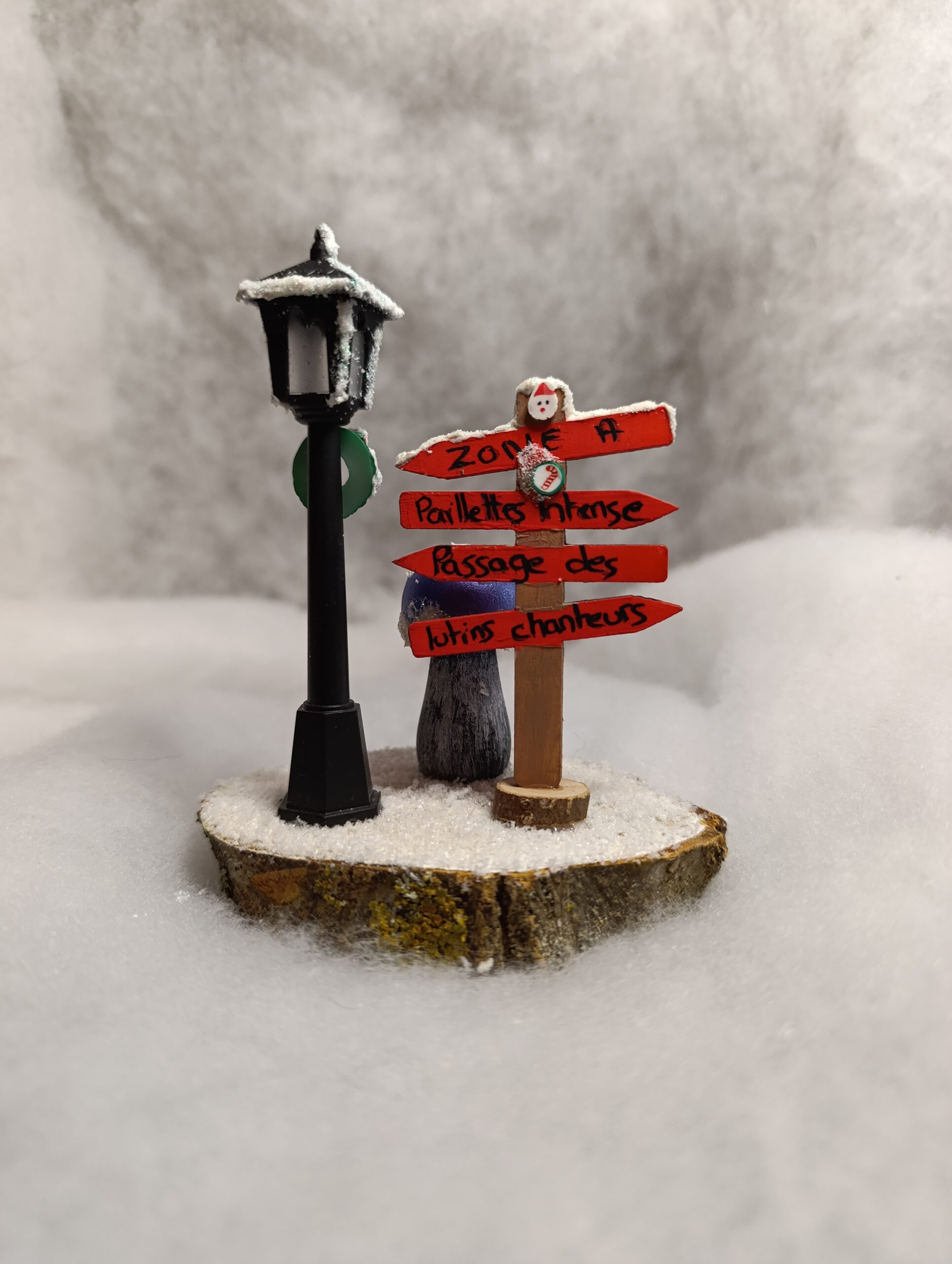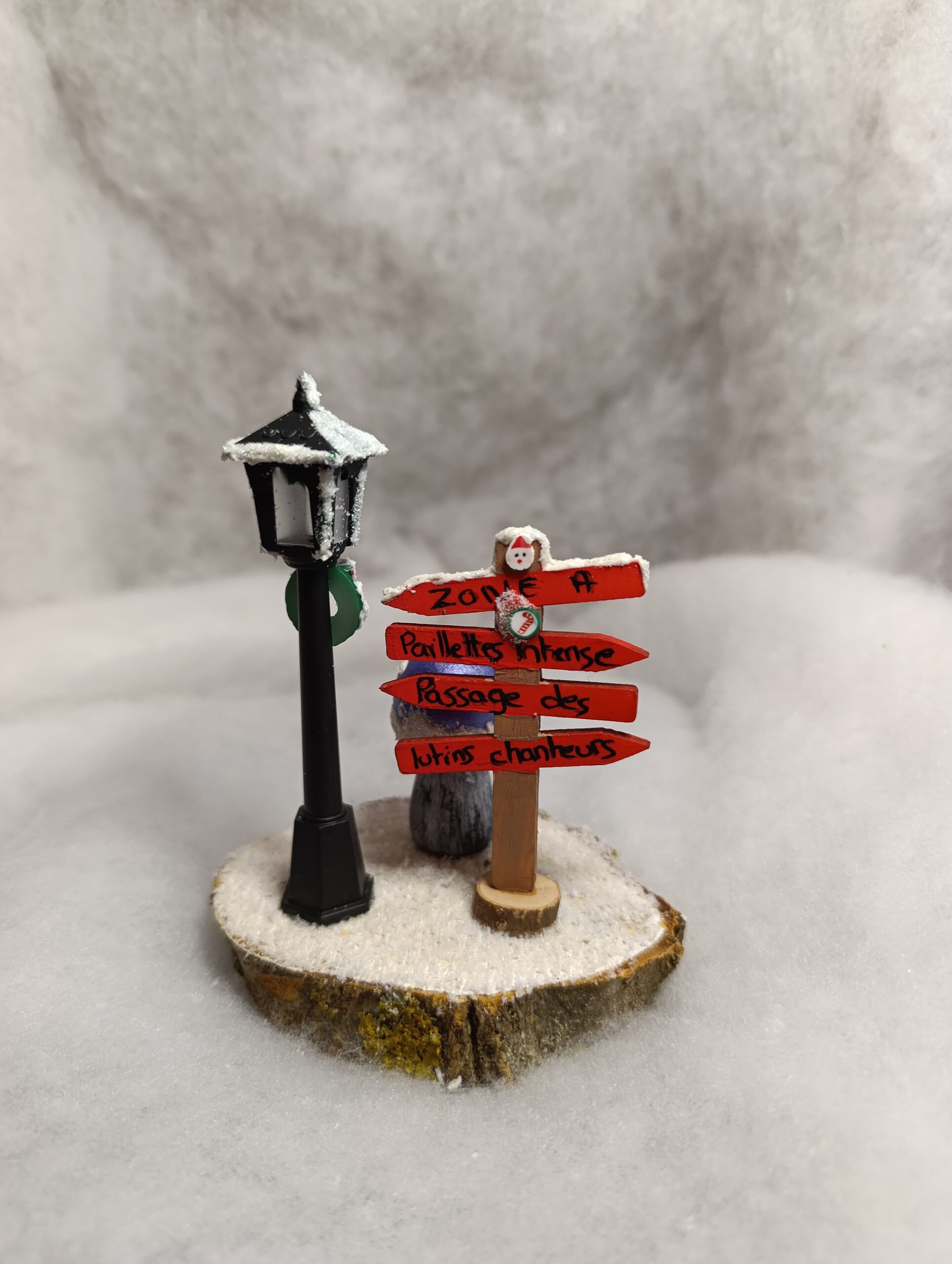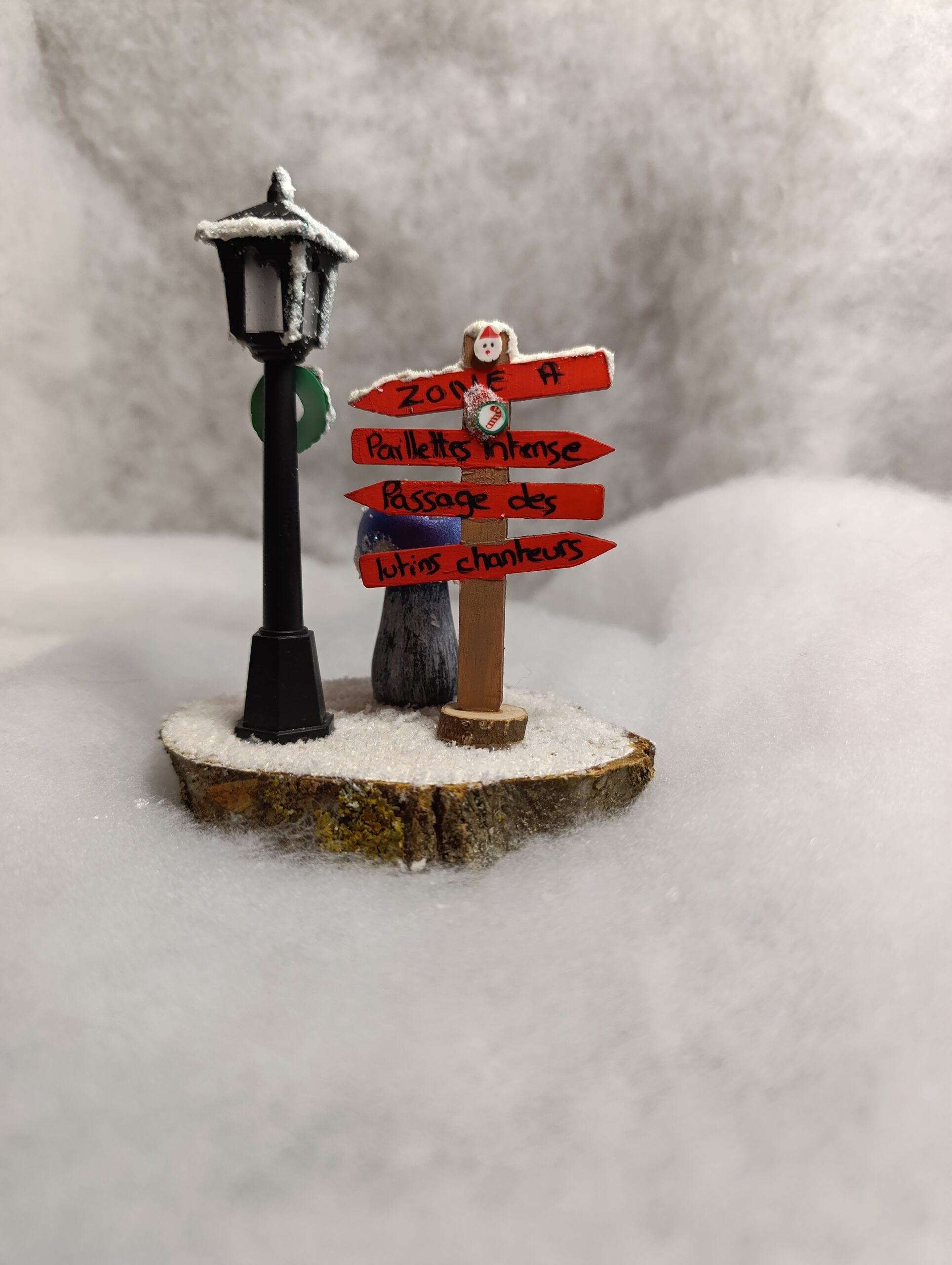 Un champignon bleu, doucement poudré de blanc, se dresse comme un repère secret. À ses côtés, un panneau directionnel un peu malicieux indique des destinations que l’on ne trouve sur aucune carte ordinaire. Le lampadaire, coiffé d’une couronne hivernale, diffuse une lumière imaginaire, suffisante pour guider les pas nocturnes des habitants du Petit Peuple.