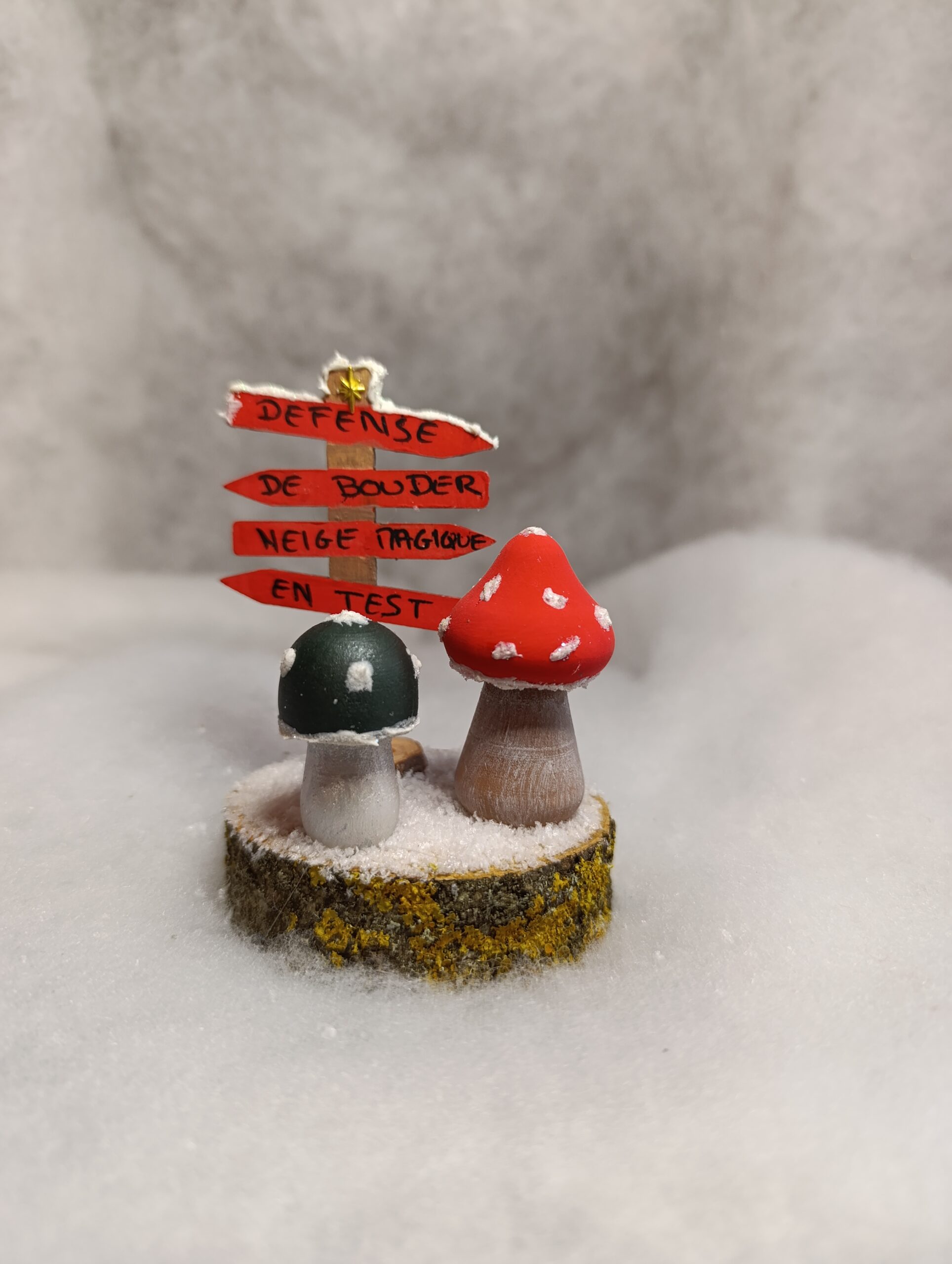 Installée sur un socle en bois délicatement enneigé, cette création évoque un univers féerique teinté d’humour, comme un clin d’œil discret laissé par les lutins sur le bord du chemin. Elle trouve naturellement sa place dans une décoration de Noël originale, poétique et légèrement décalée.