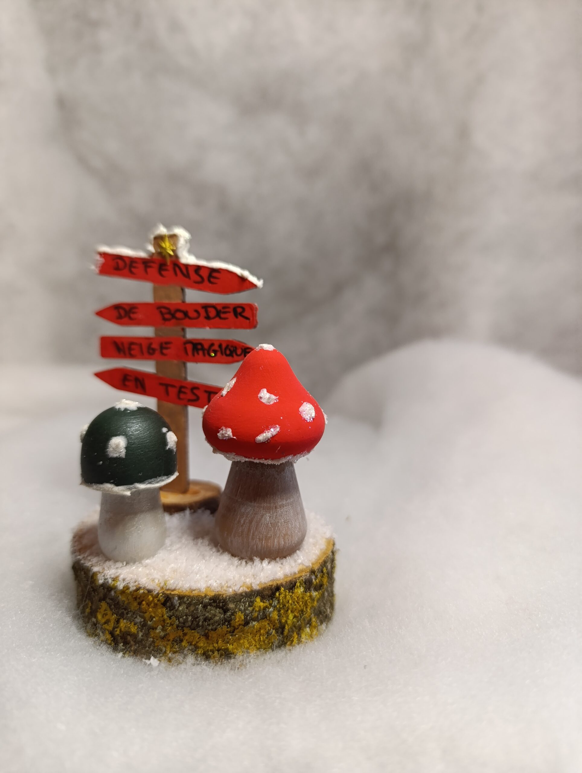 Deux champignons givrés montent la garde, tandis qu’un panneau directionnel annonce des messages aussi mystérieux que malicieusement hivernaux.