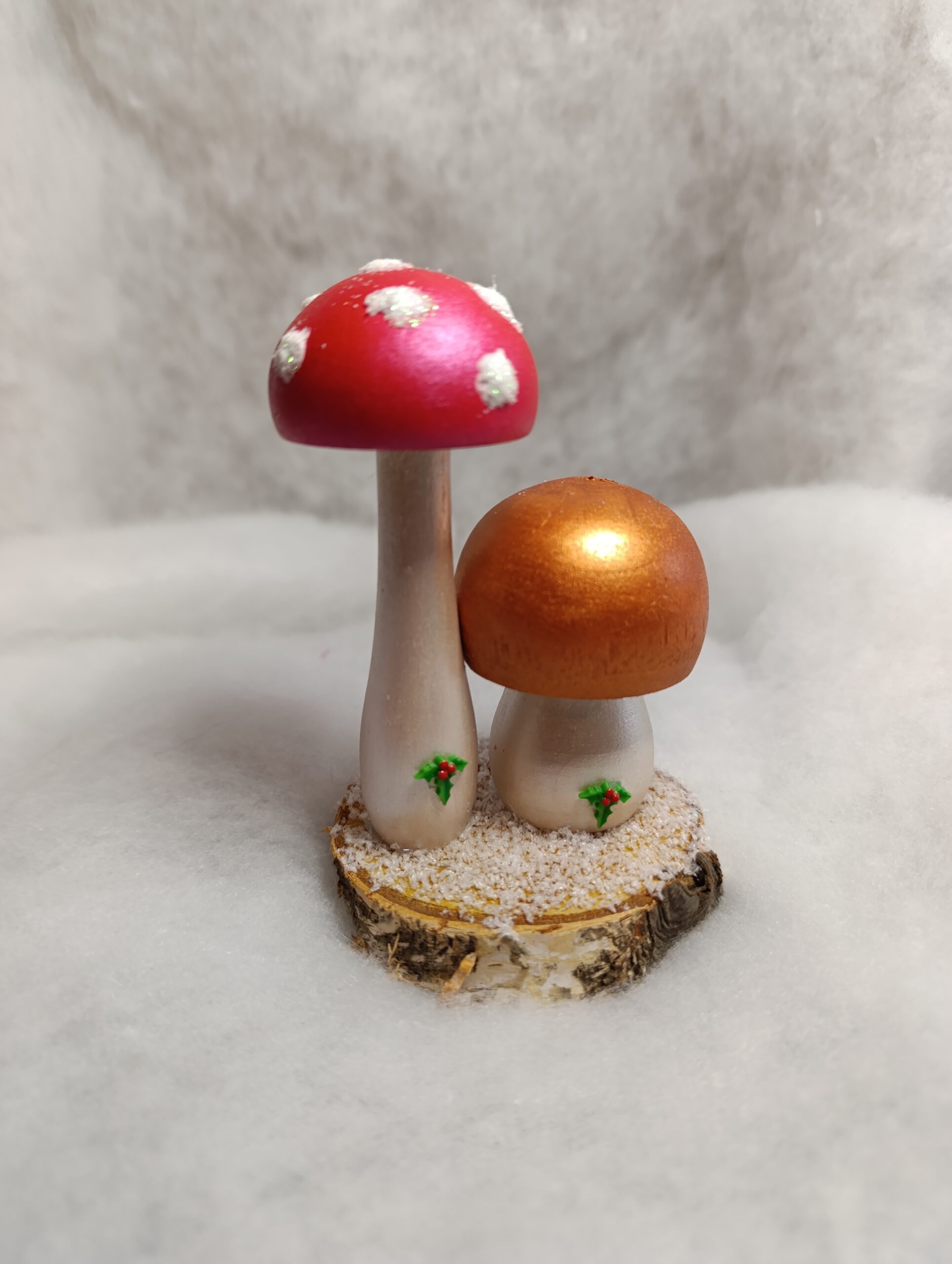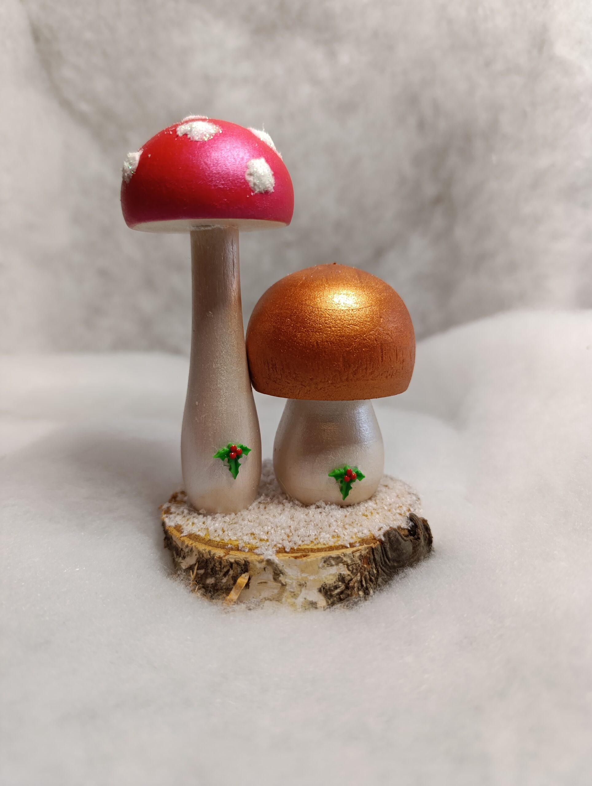 Ce duo de champignons décoratifs est installé sur un socle en bois délicatement enneigé. L’association d’un champignon rouge ponctué de détails blancs et d’un champignon cuivré crée un contraste chaleureux et lumineux, idéal pour une décoration de Noël féerique et naturelle.