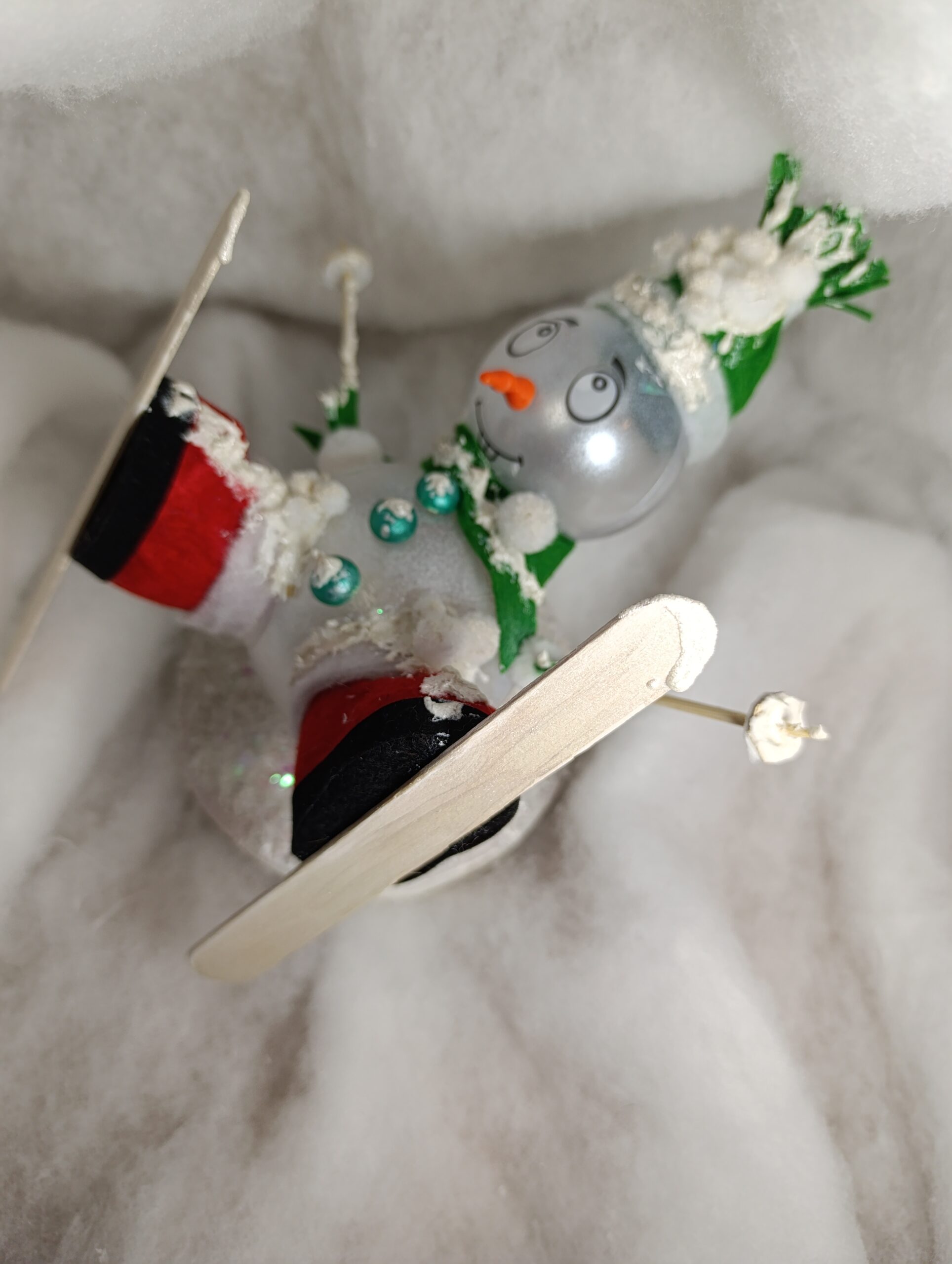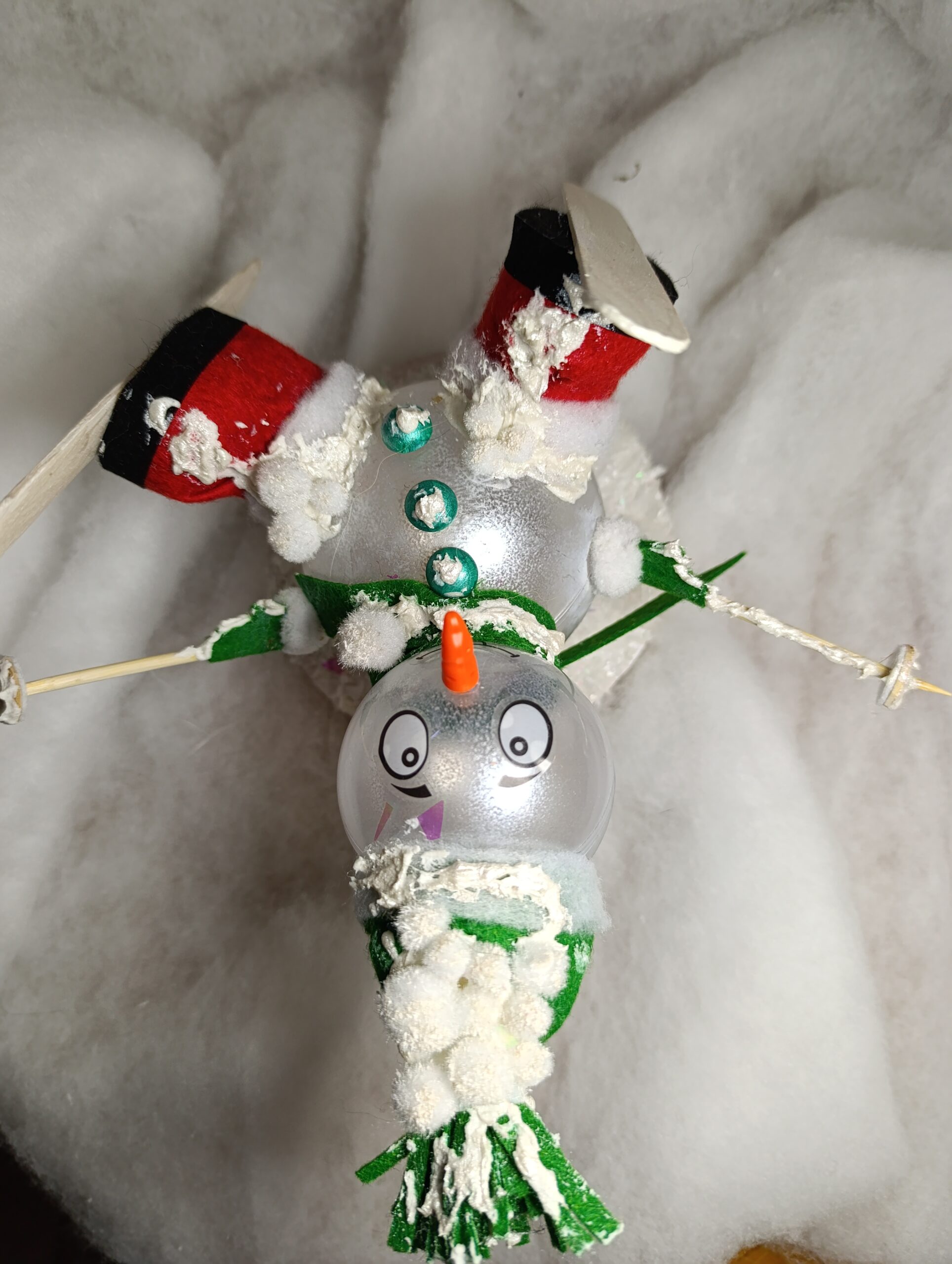 Matériaux : feutrine verte et rouge, boules givrées, neige artificielle, skis en bois