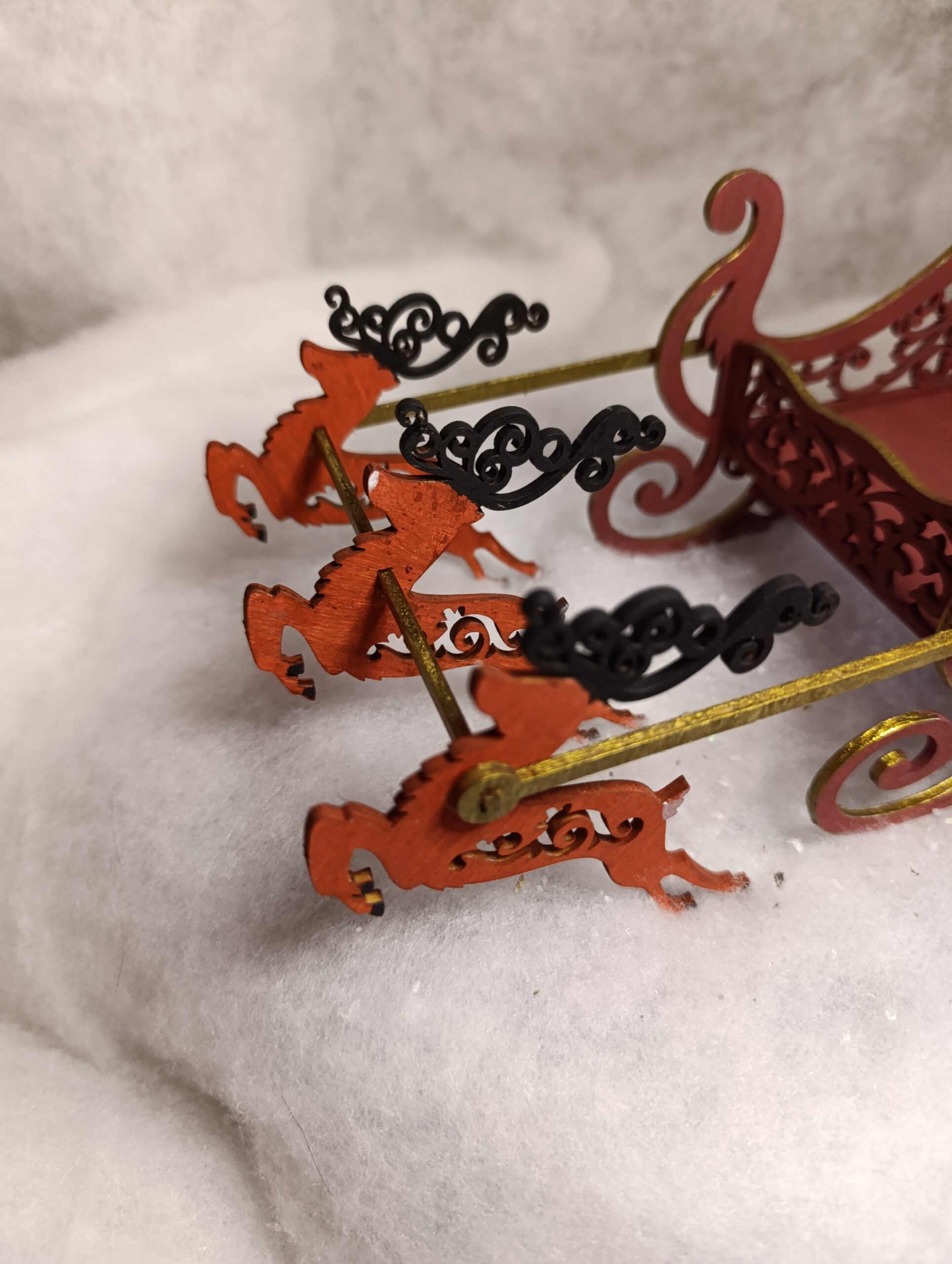 À l’avant, trois chevaux flamboyants aux silhouettes rouges, ornés de parures noires, paraissent figés dans un élan éternel. Ils ne tirent pas seulement un traîneau : ils portent une promesse. Celle d’un passage, d’un instant suspendu entre le réel et l’imaginaire, où Noël semble prendre vie sous les yeux.